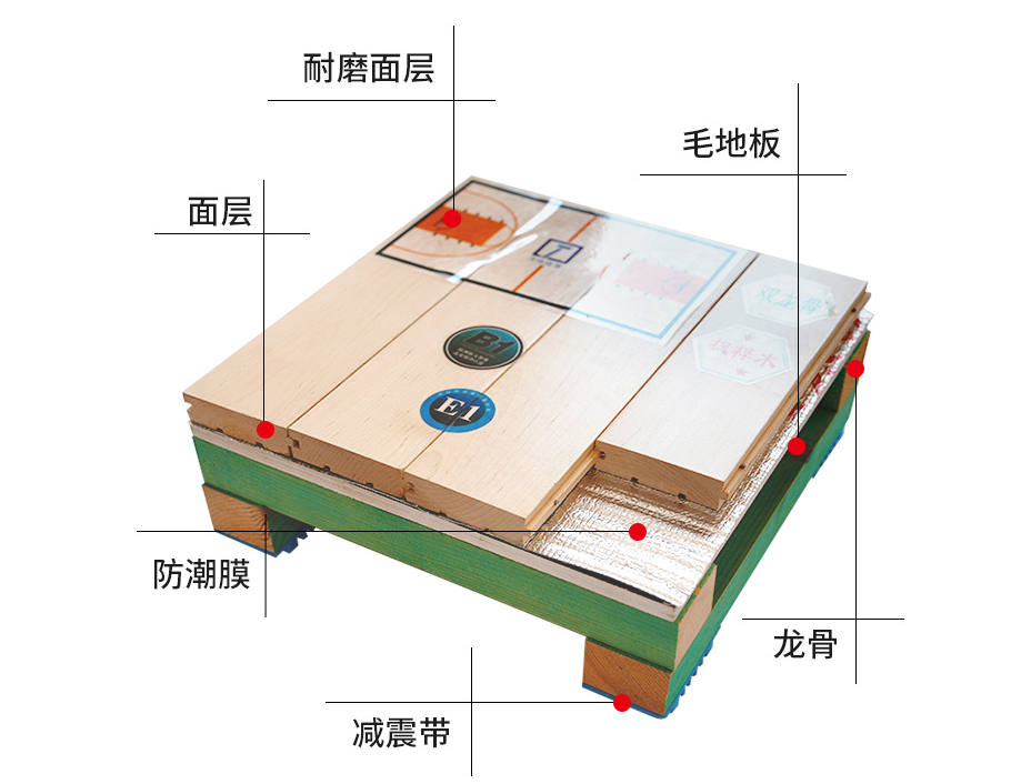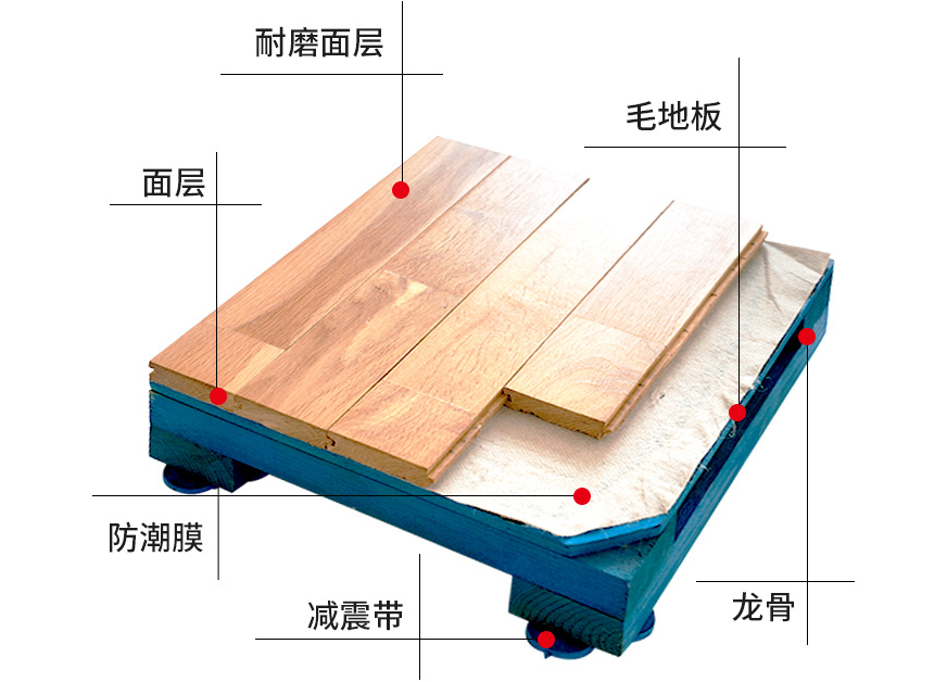 2. 雙層結(jié)構(gòu)運動木地板:這種木地板由面層地板、毛層地板、龍骨層、防潮層和彈性膠墊層等材料組成的復(fù)合結(jié)構(gòu)形式。
