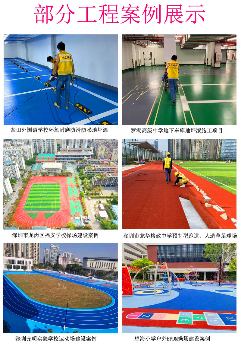 應(yīng)用場(chǎng)景:學(xué)校綜合運(yùn)動(dòng)場(chǎng)、幼兒園塑膠彩色地面、小區(qū)彩色地面和球場(chǎng)、樓頂各類球場(chǎng)運(yùn)動(dòng)場(chǎng)、各企事業(yè)單位公司工廠員工運(yùn)動(dòng)球場(chǎng)、醫(yī)院-商場(chǎng)-地下停車場(chǎng)-倉(cāng)庫(kù)-車間等各類地坪、公園市政人行道等地坪等等