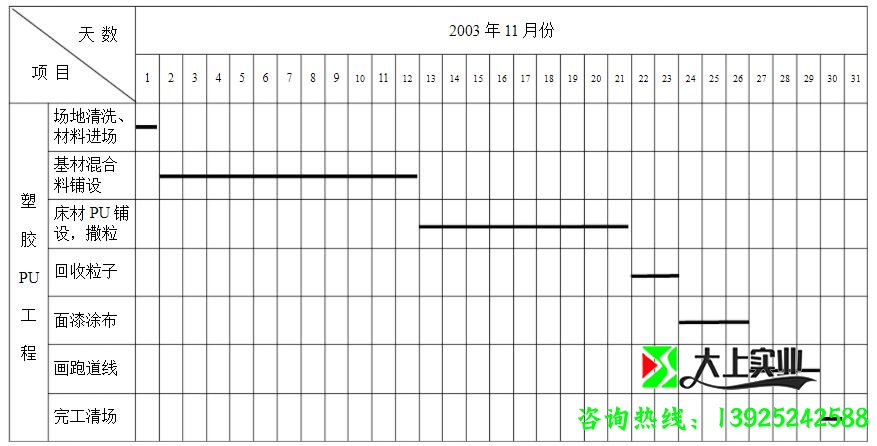 本工程施工面積大,學(xué)校要求工期短,為了保證按期完成施工任務(wù),我們在盡可能的條件下,通過合理的計(jì)劃安排,力爭在前90天內(nèi),高質(zhì)量的交付給學(xué)校使用。(完成內(nèi)容有,鏟除原有煤渣,做墊層、澆砼、鋪設(shè)瀝青砼,安裝給排水噴淋系統(tǒng),鋪設(shè)陽型面層)。