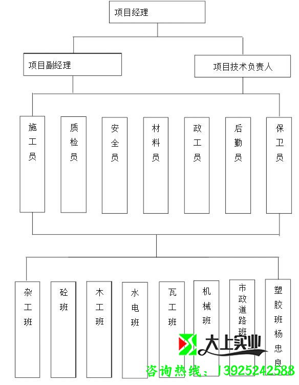 根據(jù)工程規(guī)模、特點(diǎn),本工程按項(xiàng)目管理法施工,選派有施工管理經(jīng)驗(yàn)的管理人員當(dāng)項(xiàng)目經(jīng)理,挑選有施工經(jīng)驗(yàn)的技術(shù)人員組建項(xiàng)目部,組成精銳強(qiáng)悍的建筑隊(duì),各司其職,各盡其能,上下協(xié)調(diào),群策群力,精心施工,圓滿完成施工任務(wù),施工管理機(jī)構(gòu)名單詳見:施工管理機(jī)構(gòu)組織網(wǎng)絡(luò)。