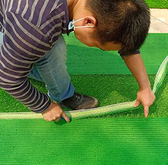 2-3分鐘后膠水揮發(fā),再把兩邊草坪慢慢放下,調(diào)整按壓兩邊草坪觸膠部位保證平整相接。