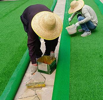 把膠水均勻的涂刷在草皮背面和兩邊草坪中間相拼處,否則會出現(xiàn)氣泡現(xiàn)象和不牢固。
