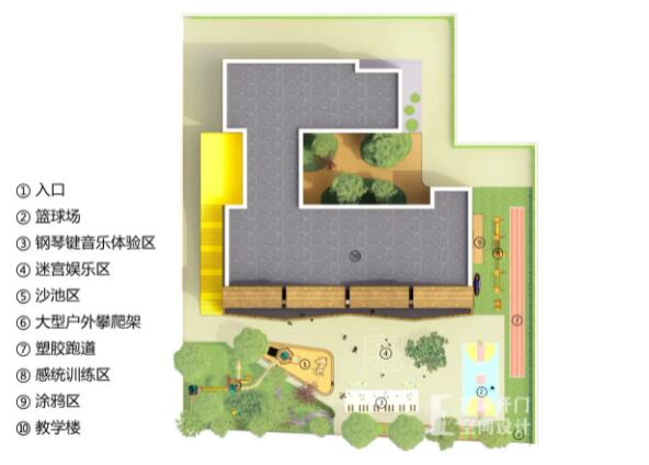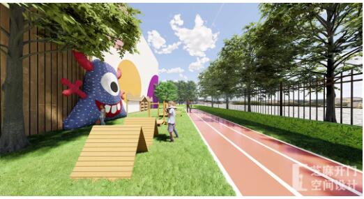 園區(qū)戶外設(shè)計(jì)中將音樂(lè)元素和涂鴉藝術(shù)融合,藝術(shù)造型配上五彩斑斕的童趣色彩,調(diào)皮而又靈動(dòng)。“紅黃藍(lán)”三色籃球場(chǎng)極其奪目,讓孩子們對(duì)色彩的認(rèn)知融入到運(yùn)動(dòng)娛樂(lè)之中。