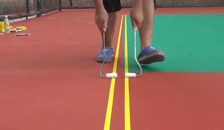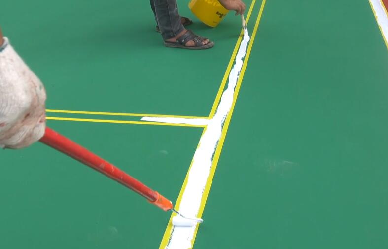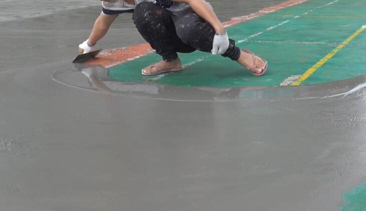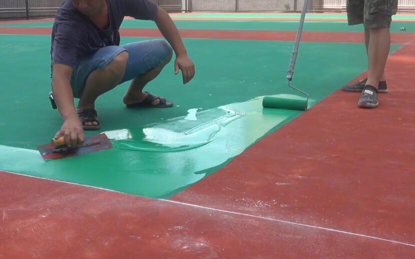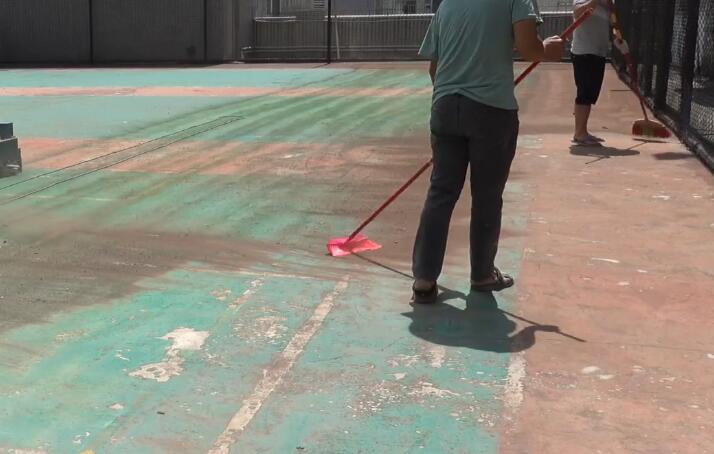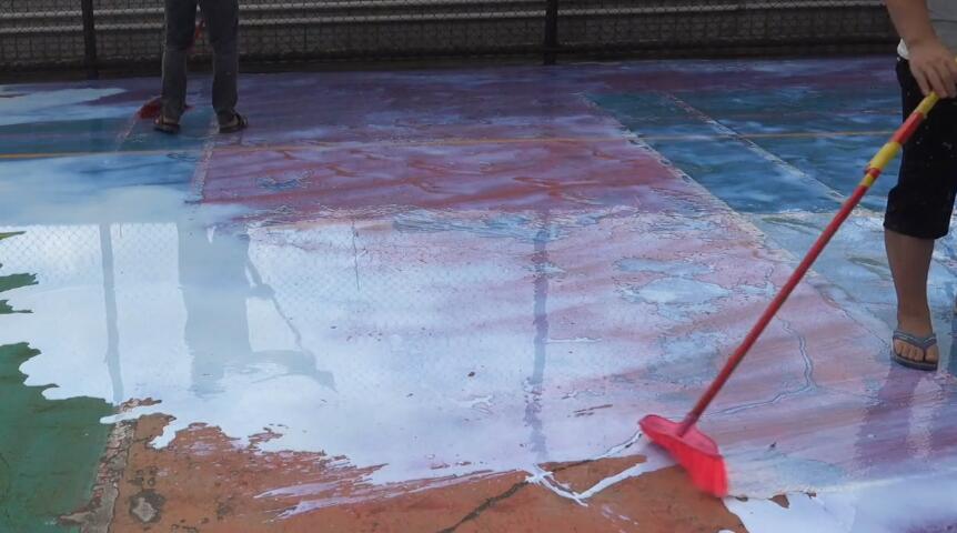 2、把攪拌好的界面劑灑在地面上并均勻掃開,界面劑的主要作用是封閉水泥層毛細(xì)孔,加強(qiáng)基面和丙烯酸球場面層的附著力。