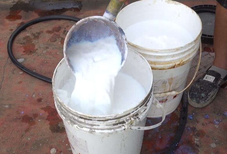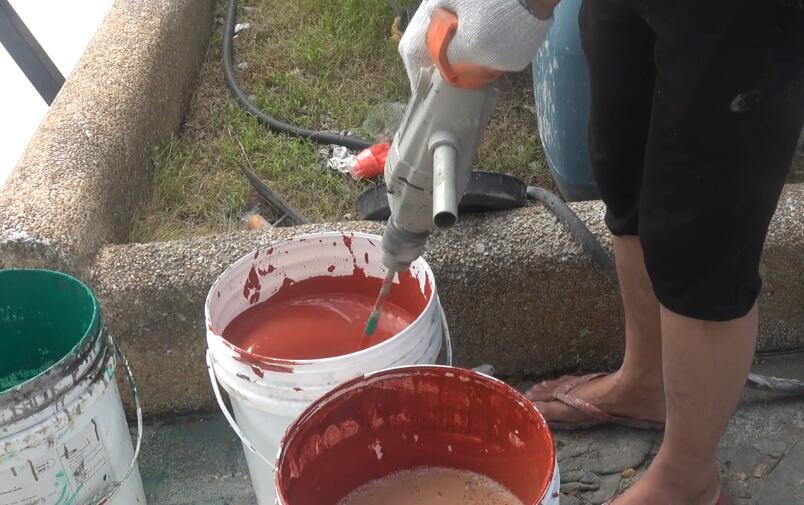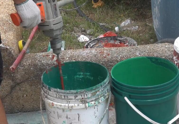 2、將綠色丙烯酸球場材料倒入桶里并用攪拌器攪拌均勻