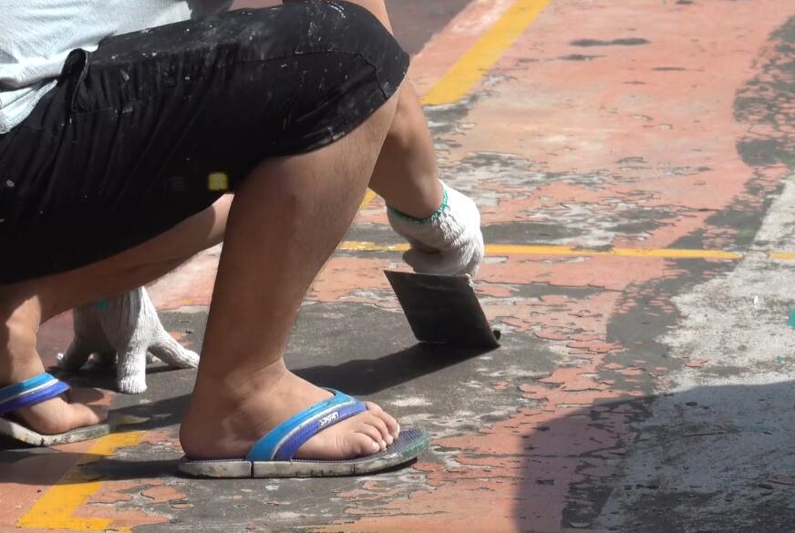 1、首先用灰刀將舊地面上的丙烯酸舊漆鏟除掉,把舊漆鏟掉主要是讓新作的丙烯酸球場地坪漆可以更有附著力。