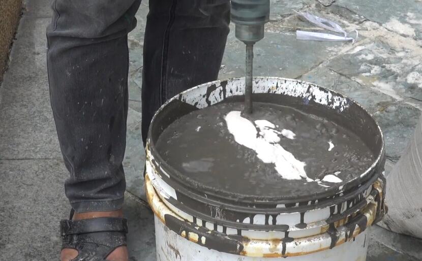 1、等界面劑晾干后,就可以進(jìn)行第一道砂漿的施工。準(zhǔn)備半桶水,加入32.5標(biāo)號的水泥,再倒入石英砂,再把它們攪拌均勻。