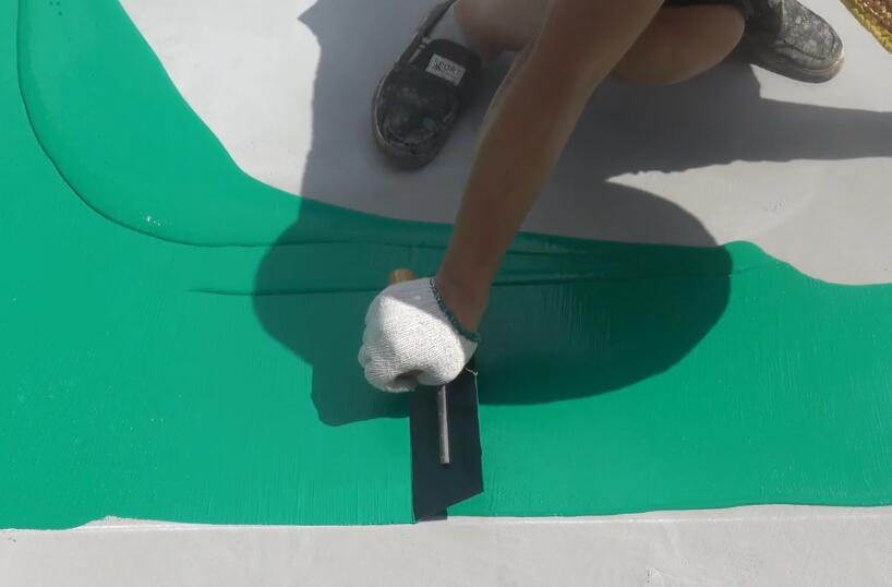 3、把材料倒在地面上,用刮刀均勻刮平,刮的時(shí)候要注意標(biāo)記線的位置,因?yàn)椴煌瑯?biāo)記的區(qū)域顏色不一樣。