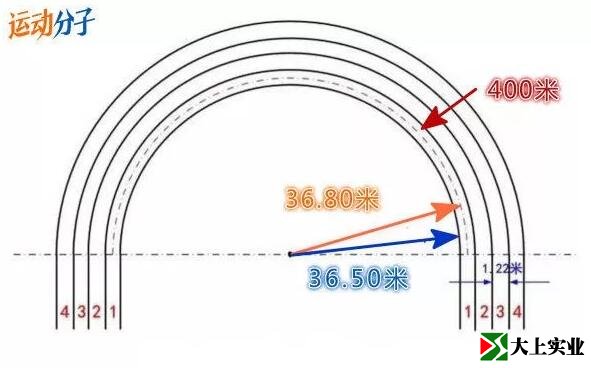 02 彎道半徑弧度是36.5米,直道的長度則是84.39米。(π × 36.5米+84.39米)× 2=498.116米就是標準體育場內(nèi)圈(第一道)內(nèi)圈線的距離,比400的“標準”短了差不多兩米。目前世界上大型場館的田徑跑道都是以這個標準修整的。