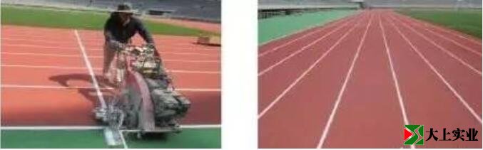 按照國際田聯(lián)IAAF《田徑場地設(shè)施標準手冊》2008版標準進行劃線,采用全站儀進行放線操作,盡量使用白灰線盒,避免使用黑色線盒。由專業(yè)劃線師完成大面積的劃線。接頭以及數(shù)字部分由助手使用數(shù)字模具噴涂而成。使用的面漆盡量要求是聚氨酯耐黃變面漆,該材料具有較好的伸長率,與下面的顆粒粘接良好,不容易脫落與黃變褪色。