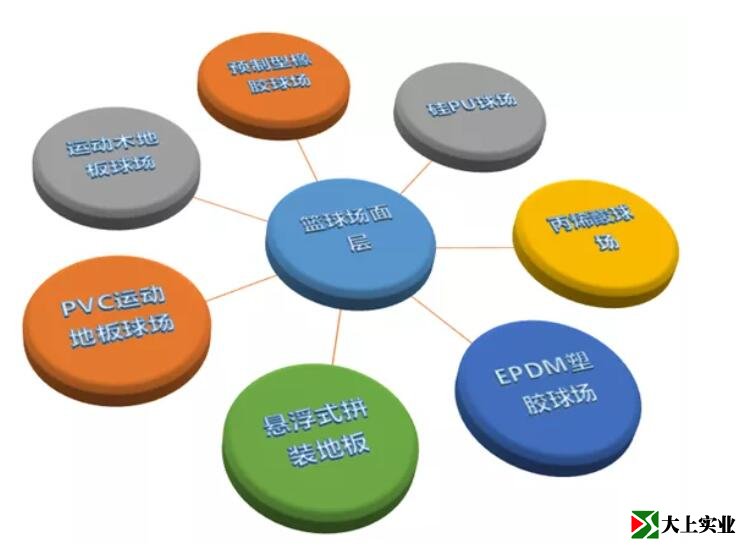 大上實業(yè)小編就通過一張圖介紹籃球場面層材料的分類,再詳細論述各種材料面層的特點,讓您對如何選擇籃球場面層材料做到心中有數(shù)。羽毛球場、排球場等也可參照這些標準選擇。