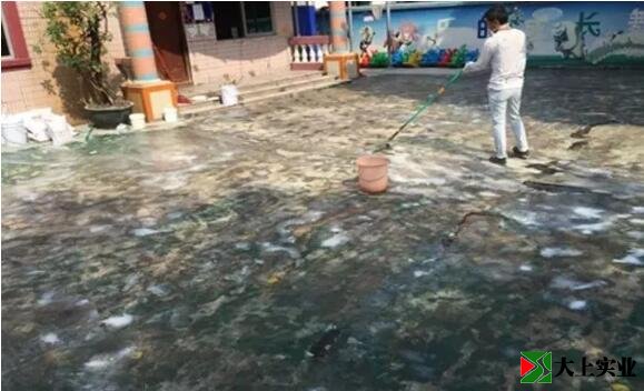 使用水性丙烯酸底漆按比例兌好后,使用電動(dòng)攪拌機(jī)充分?jǐn)嚢杈鶆?,用滾筒滾涂地面,待干后進(jìn)入下一步工序。(1層)