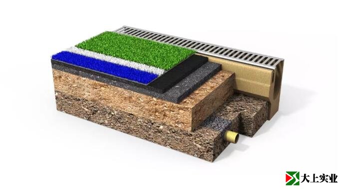 此外,在運動場表層需要設(shè)置一個排水口。在端線后面,有3米寬的人造草坪緩沖區(qū),2米寬的空白區(qū),這部分通常是鋪砌地面。在邊線的后面,除了1米的排水區(qū)外,建議再增加3米的人造草坪緩沖區(qū)。