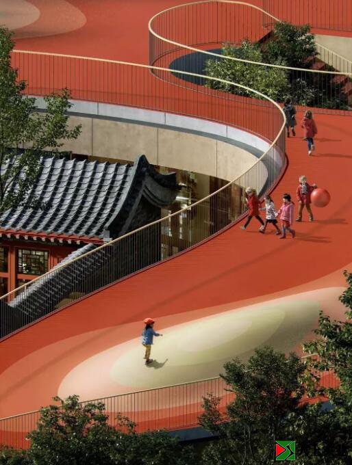 北京的四合院幼兒園由MAD設(shè)計(jì),馬巖松說(shuō):“老北京有句形容孩子淘氣的俗話,‘三天不打,上房揭瓦’。屋頂對(duì)孩子來(lái)說(shuō)是充滿魔力的。在四合院空間中,屋頂就像是一片新的大地,是無(wú)拘無(wú)束、自由的象征。”