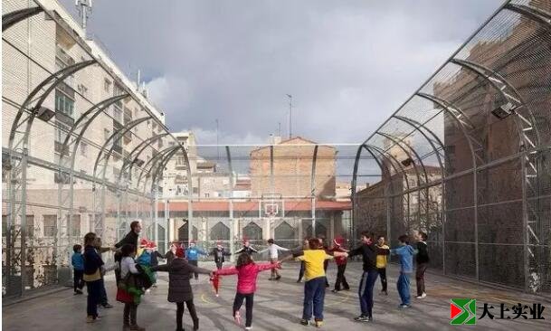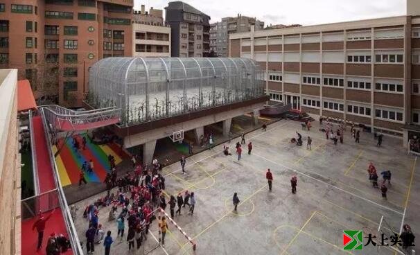 Lasalle Franciscanas學校位于西班牙Zaragoza,其操場經(jīng)常用于學生的課間娛樂,課外活動以及孩子們與家長間接送的集散空間。于是常常造成使用上的重圖,進出校門的人群與操場上正在活動的學生間的相互干擾。于是當?shù)豃1 arquitectos 事務所的建筑師Guzman de Yarza Blache被委以此任,要求在擴大33*35米操場的使用面積的同時,在不影響學校日常體育和休閑活動的前提下,滿足接送家長人員流動的需求。