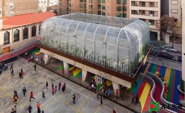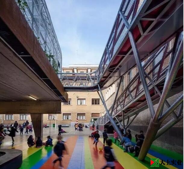 在擁擠的城市中,空中跑道顯得格外醒目。這一智慧的概念,緣于場地極為有限的用地面積。土地有限,但是學生們需要有一個活動的空間······