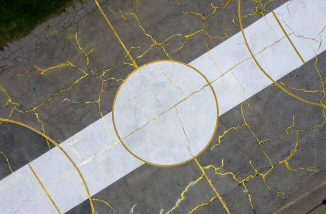 這位藝術(shù)家用金粉環(huán)氧樹脂填充了球場上的裂縫。他說:“體育有娛樂、鼓舞人心和轉(zhuǎn)移注意力的作用,但重要的是,它讓我們更健康。”