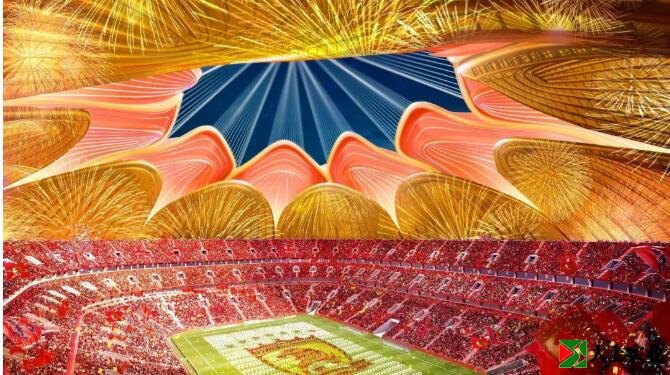 看到開工儀式的主KV,我就已經感覺不妙了。這撲面而來的災難配色,只能說,呃……很恒大。乍一看前面兩張足球場的效果圖,就還是很……恒大。