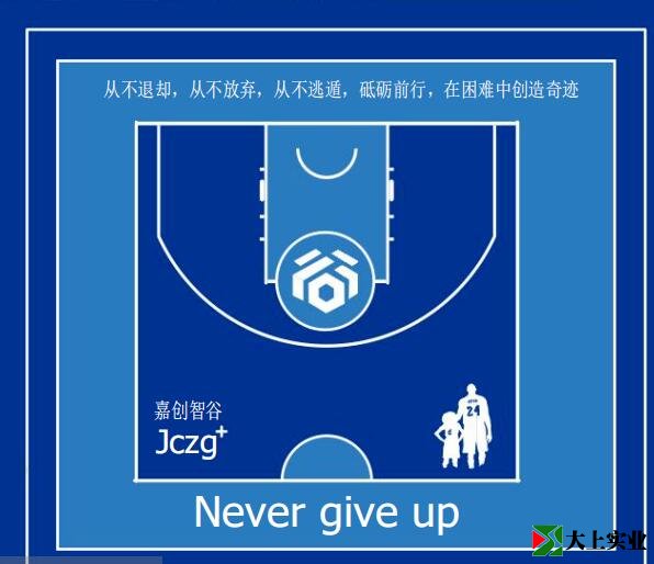 球場中間是嘉創(chuàng)智谷的園區(qū)Logo,正前方噴涂著“嘉創(chuàng)人”追求的企業(yè)精神:從不退卻、從不放棄、從不逃遁、砥礪前行、在困難中創(chuàng)造奇跡。球場后方噴涂著英文“Never give up”(永不放棄)。