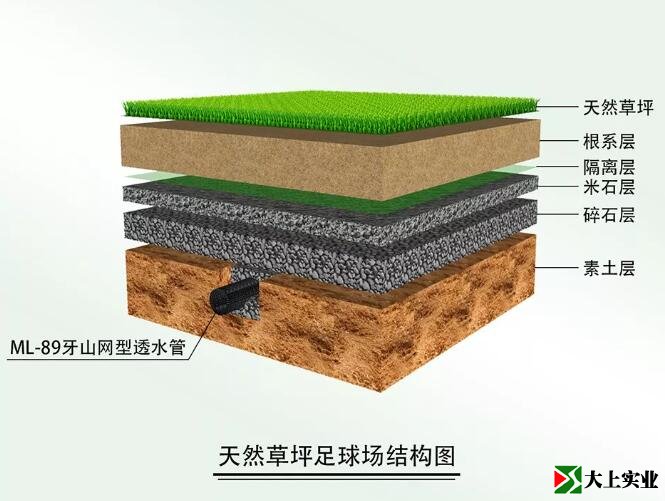基于環(huán)境保護(hù)和運(yùn)動安全考慮,大上實(shí)業(yè)總結(jié)了天然草坪及棒球場紅土層做法,發(fā)明了一種可塑透水軟基礎(chǔ)結(jié)構(gòu)及施工方法,該可塑透水軟基礎(chǔ)透水性好(無積水現(xiàn)象)、可塑性好(平整度容易控制)、硬度適中(接近天然草坪足球場硬度)。同時,若想把人造草坪改成天然草坪,只需清除掉人造草坪面層,對原有基礎(chǔ)簡單處理,便可直接種植天然草坪,實(shí)現(xiàn)了人造草坪和天然草坪之間的自由切換,簡單、方便、耗資少。