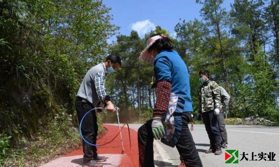 4月14日上午,在桃花源街道田家蓋附近的二酉山人行步道終點,幾名工人正搶抓晴好天氣,噴涂路面保護劑。